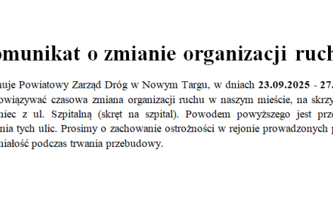 23 września 2025Jak informuje Powiatowy Zarząd Dróg w Nowym Targu, w dniach 23.09.2025 - 27.10.2025 będzie obowiązywać czasowa zmiana organizacji ruchu w naszym mieście, na skrzyżowaniu ul. Kowaniec z ul. Szpitalną (skręt na szpital). Powodem powyższego jest przebudowa skrzyżowania tych ulic. Prosimy o zachowanie ostrożności w rejonie prowadzonych prac oraz o wyrozumiałość podczas trwania przebudowy. -