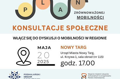 W terminie od 12 do 22 maja odbywać się będą konsultacje społeczne dotyczące Planu Zrównoważonej Mobilności Podhalańskiego Obszaru Funkcjonalnego*. W trakcie czterech warsztatowych spotkań mieszkańcy będą mogli podzielić się swoimi pomysłami na usprawnienie przemieszczania się w regionie.