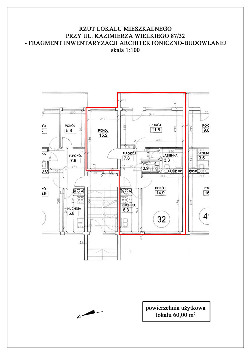 7. LOKAL MIESZKALNY NR 32 w budynku wielomieszkaniowym przy UL. KAZIMIERZA WIELKIEGO 87 W KRAKOWIE, o pow. użytkowej 60,00 m2 z pomieszczeniem przynależnym – piwnicą o pow. 2,60 m2 (objęty księgą wieczystą nr KR1P/00694943/8) wraz z udziałem 626/40793 części w nieruchomości wspólnej stanowiącej grunt oznaczony jako działka ewid. nr 552/4 o pow. 0,4119 ha położona w jednostce ewid. Krowodrza, obręb K-3 oraz części budynku i urządzeń, które nie służą wyłącznie do użytku właścicieli lokali.