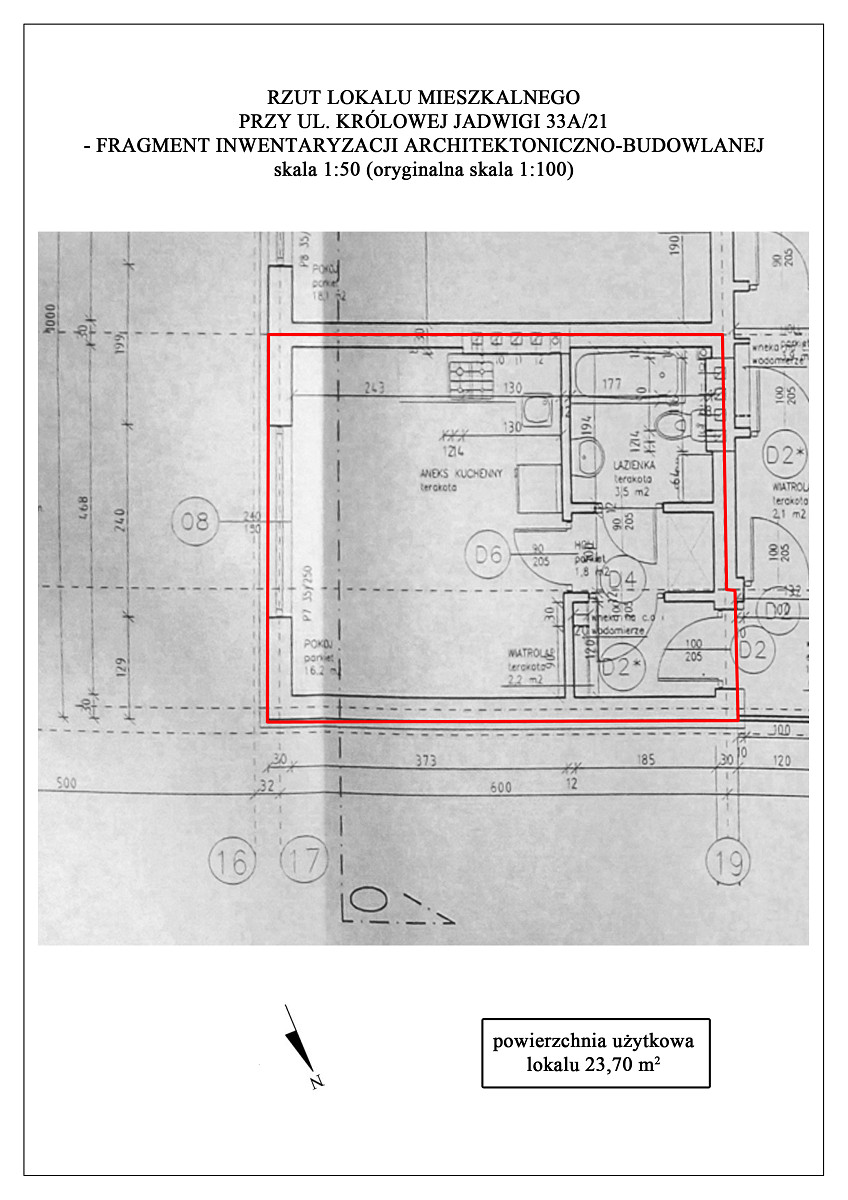 5. LOKAL MIESZKALNY NR 21 w budynku wielomieszkaniowym przy UL. KRÓLOWEJ JADWIGI 33A W KRAKOWIE, o pow. użytkowej 23,70 m2 (objęty księgą wieczystą nr KR1P/00544285/1) wraz z udziałem 280/10000 części w nieruchomości wspólnej stanowiącej grunt oznaczony jako działka ewid. nr 38/12 o pow. 0,0978 ha położona w jednostce ewid. Krowodrza, obręb K-13 oraz części budynku i urządzeń, które nie służą wyłącznie do użytku właścicieli lokali.