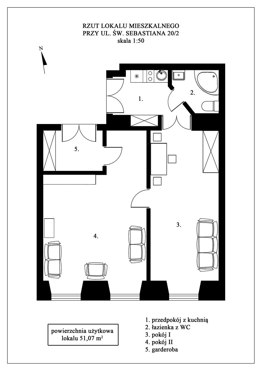 1. LOKAL MIESZKALNY NR 2 w budynku wielomieszkaniowym przy UL. ŚW. SEBASTIANA 20 W KRAKOWIE, o pow. użytkowej 51,07 m2 (objęty księgą wieczystą nr KR1P/00271356/5) wraz z udziałem 268/10000 części w nieruchomości wspólnej stanowiącej grunt oznaczony jako działka ewid. nr 46 o pow. 0,0938 ha położona w jednostce ewid. Śródmieście, obręb S-3 oraz części budynku i urządzeń, które nie służą wyłącznie do użytku właścicieli lokali.