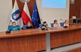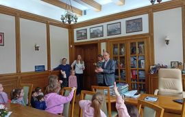 Dzieci swój pobyt w Urzędzie Miasta rozpoczęły od wizyty w sali obrad, gdzie uroczyście przywitał ich Burmistrz Miasta Grzegorz Watycha oraz Naczelnik Wydziału Obsługi Mieszkańców i Przedsiębiorców Pani Edyta Garb.