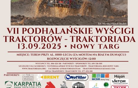 12 września 2025Stowarzyszenie Czysty Świat i Miasto Nowy Targ zapraszają na VII Podhalańskie Wyścigi Traktorów - Traktoriada, które odbędą się 13 września br w Nowym Targu. Miejscem wydarzenia będzie teren przy al. 1000-lecia (droga krajowa 49) za mostem na Białym Dunajcu. -